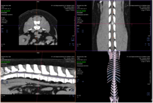 Ein weiterer wesentlicher Einsatzbereich besteht in der Diagnostik von Discopathien. Etwa 95 % der operativ relevanten Bandscheibenextrusionen lassen sich mittels CT eindeutig diagnostizieren – insbesondere klassische Hansen-Typ-1-Vorfälle bei chondrodystrophen Hunden. Grenzen bestehen vor allem bei fibrocartilären Infarkten, Hansen-Typ-3-Vorfällen oder sehr weichteilbetonten Veränderungen wie Tumoren im Bereich des Rückenmarks. In diesen speziellen Fällen kann das MRT die präzisere Methode sein; im klinischen Alltag jedoch reicht das CT in der überwiegenden Mehrzahl der Fälle aus, um eine sichere operative Entscheidung zu treffen.